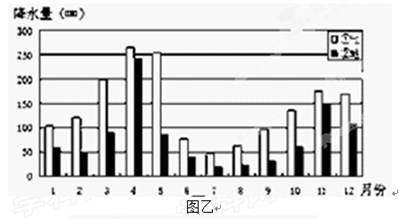 (2)读图甲可以看到,①地位于湖泊西岸,②地位于湖泊东岸。虽然有赤道穿过,但是因位于高原地形上,属于热带草原气候。夏季,气压带、风带北移,受印度洋暖湿东南信风(偏东风)的影响,东南信风经过湖面,空气湿度增加,气流受山地阻挡,①地正好位于山地迎风坡,多地形雨。所以如图乙中降水量统计图所示,①地年降水量较②地多。