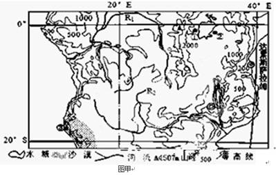 (1)读图,根据经纬度可以判断R1是刚果河,位于热带雨林气候区,降水量大, 河流流量大,含沙量小,水位季节变化小。由图中等高线可以判断R1河口地段等高线密集,河流落差大,流速快。 R2 是赞比西河,主要位于热带草原气候 区,降水较少,河流流量小,含沙量较大,水位季节变化大。河口地区等高线比R1河口稀疏,落差较小,流速较慢。