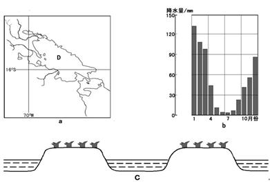 本题解析:本题考查世界区域地理和资料综合分析能力。(1)区域定位该图D湖泊为南美洲的的的喀喀湖(世界海拔最高淡水湖),纬度较低(26°S),由于海拔较高(3800米),其气温季节变化是夏凉冬暖(类似于昆明)故气温的年变化小,同时又由于海拔高,大气稀薄,对太阳辐射的削弱、保温作用差,所以气温的日变化大。降水特征的叙述需要说明量是多还是少,有多少,有何时间变化规律。气象灾害有哪些?气象灾害是由气候状况(气温、降水)决定的,该地气温对耕作业不利的主要是气温的日变化大,夜晚会出现低温;降水季节分配不均,必然出现旱涝灾害。(2)图6c显示人工堆土高台、人工水渠相互交织,D湖沿岸地区地形平坦,但为什么要修建水渠呢,又如何解决夜晚低温(利用热容量大的特性)、旱涝(利用水渠的调蓄功能)。