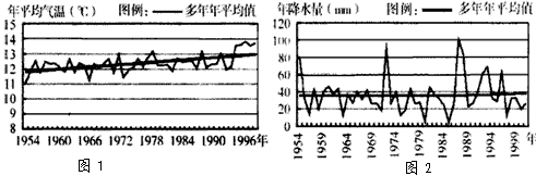 4、单选题 图1和图2是我国某地近50年气温和降水统计图。读图回答1—2题。