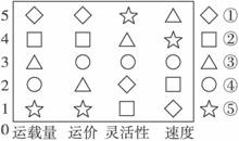 4、单选题 读下图,完成(1)—(2)题(纵坐标1—5代表各种运输方式四项指标由优到劣的大体次序)。