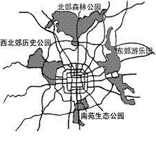 1、单选题 图为“北京市道路网和国家森林公园分布示意图”,读图完成。