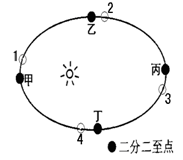 3、单选题  2010年10月20日从国家海洋预报台获悉,今年第13号台风“鲇鱼”目前位于南海东北部海面上(118.4°E,22°N),可能于10月23日下午到傍晚在福建南部沿海登陆。结合从北极上空看地球公转“二分二至”日示意图,回答下列各题: