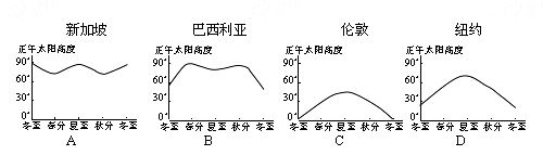 小题2:下列四座城市正午太阳高度季节变化的示意图,接近实际的是