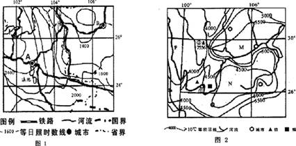 (2)2000℃;M为四川盆地,海拔低,热量条件好,?N为云贵高原,海拔高,热量较低。