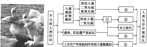 4、单选题 左图为“北极地区景观图”,右图为“人类活动引起的环境问题示意图”。读图完成下列各题。1.左图中的景观反映了右图中的环境问题是