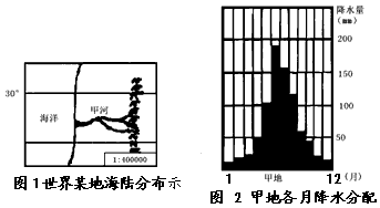 1、图1中另一条纬线的度数与图中30°纬线相差10个纬度,根据两图中信息判断甲地位置和气候类型是