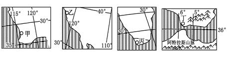 (1)图中甲、乙、丙、丁四地气候类型在全球的分布规律是?。(2分)