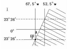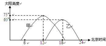 小题2:若8小时后,乙地太阳高度达当日最大,则乙地此时北京时间为10:00,太阳直射点地方时为12:00,则直射点的经度为150°E,直射点的纬度为20°S,所以直射点位于澳大利亚东海岸,附近为东澳大利亚暖流流经区,热带沙漠气候位于澳大利亚的西海岸。所以本题选择B选项。