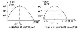 2.图示纬度位置15°S的太阳高度最大达90°,故判断太阳直射点位于15°S,正午太阳高度自15°S向南北两侧递减,故纬度:a>b;c<d;b<c;故A项正确。