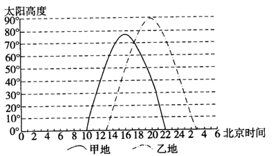 4、单选题 下图是为6月22日甲乙两地太阳高度日变化示意图,回答下题。