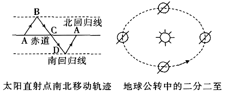 (2)将下面太阳直射南北移动轨迹图ABCD标在地球公转的二分二至图中相应日期地球所在位置旁。(2分)