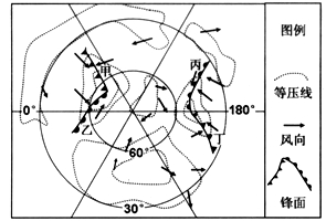 2、单选题  下图是某日极地附近风向示意图。据此回答1-2题。