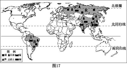 2、综合题 图中B、R、I、C四个国家被称为“金砖四国(BRIC)”。读图回答下列问题。(10分)