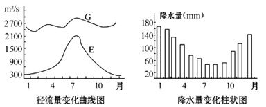 材料二 不同地点测得的径流量变化曲线图和E点以上流域的降水量变化柱状图。