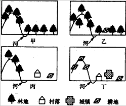 3、单选题 ? 下图为一组剖面景观示意图,反映了世界某地区土地利用状况由图甲→图丁时期历史变化过程。(图甲时期→图丁时期气候变化甚微,可忽略不计;图中河流断面位于中游处)据此,判断1—3题。