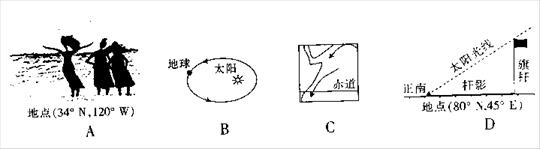 试题中时间是7月27日,B图地球位置位于远日点之前,日期应为7月初之前。奥运会开幕时,A图地方时为12点12分,图示现象有可能发生。C图中洋流为逆时针流向,根据纬度及陆地轮廓判读为北印度洋,七月份洋流流向是顺时针。伦敦经度是0°,20点奥运会开幕时,D图应该是23点,太阳不会位于正北方。