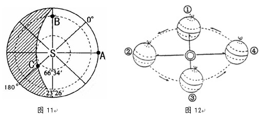 2、填空题 图11为南半球俯视图,图12中阴影部分表示黑夜,据图完成下列问题(11分)
