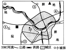 1.有关图中城市形成和发展的区位条件叙述正确的是2.城中甲地为一钢铁厂,因城市发展需要,欲将钢铁厂迁往周边小城镇,下列四地