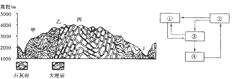 5、单选题 图1为我国西南某区域地质剖面图,图2为地壳物质循环示意图,读图回答下列小题。