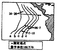 本题解析:从海岭的形成原因分析,由于板块的张裂,岩浆喷发上涌形成的山岭。上涌地层年龄结构年轻。因此在c,d处。选择C项。