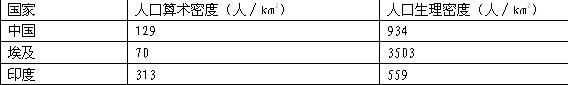 人口算术密度是一个国家的总人口数与总面积之比,人口的生理密度是一个国家的人口总数与可耕地之比。表中是中国、美国和印度三国的数据