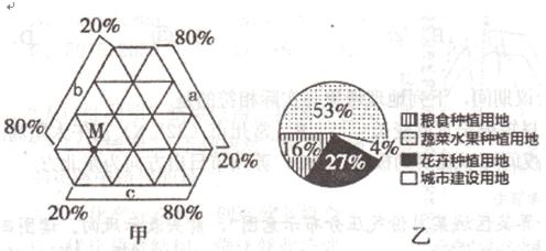 2、单选题 图中甲表示我国某县2012年农业发展的部分数据(其中a表示花卉,b表示果蔬,c表示粮食),乙表示该县今后的农业土地规划数据。读图回答下列问题。
