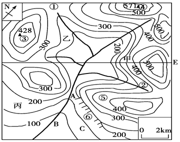 (1)读图可知,②处有河流流过且从等高线图可知海拔中部低两侧高为山谷,⑥处等高线重合,说明为陡崖。