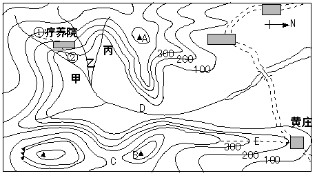 1.该地山脉的大致走向是2.关于图中甲、乙、丙、丁四地的说法错误的是