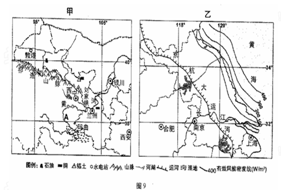 (1)描述乙图中有效风能的分布特点,并分析江苏省开发利用风能的主要原因。(8分)