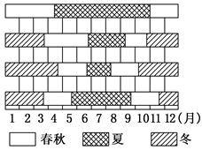 1、单选题 图为我国北京、广州、武汉、哈尔滨四个城市的季节分配示意图。图示季节分配自上而下依次为