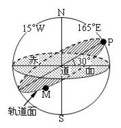 5、单选题 下图为某宇宙飞船M绕地球公转轨道及方向的示意图。M第一次到达P点时的时间是2013年5月5日16时(美国太平洋时间),飞船往返于最南与最北的时间间隔是1小时。据此回答下列各题: