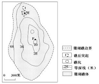 4、单选题  下图为“某地一处完全淹没在海面下的珊瑚礁体的等深线示意图”。读图,回答下列小题。