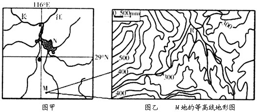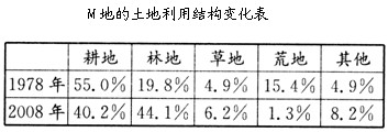 4、综合题 图甲示意我国某区域的水系分布。某学校研究性学习小组对图甲中的M地进行实地考察,并查阅了相关资料,发现近三十年来M地生态环境明显改善。图乙示意M地的等高线分布,表格示意M 地的土地利用结构变化。读图表回答16题。