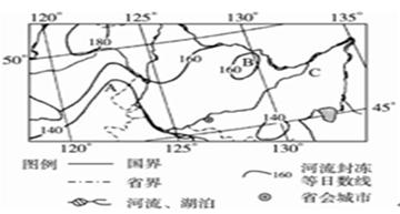 (2)图中B处河流封冻日数H的取值范围是?。(2分)