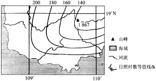 该地区(地处热带季风气候区)1月份盛行东北风。图示地区山峰以南、以西为背风坡。迎风坡多阴雨天气,日照时数低;背风坡少雨,多晴暖天气,日照时数高。(课程标准卷)下图所示区域降水季节分配较均匀。