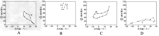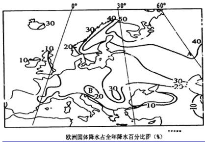 D、B处固体降水占全年降水百分比可能是10%—20%