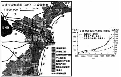 参考答案:(l)经济快速增长工业总产值迅速增长(工业发展迅速)?外贸出口总额迅速增长(外向型经济增长迅速)(任答2点,得2分)?(2)交通运输(2分)?沿海、沿河、沿铁路(高速公路)伸展(2分)(3)地处河流下游、铁路沿线和沿海港口附近,交通便捷,便于货物的集散(1分)地处滨海新区,经济发展迅速,货物集散量大(1分)?位于滨海新区的中心(l分)交通干线的交汇处(1分)?(4)分散中心城区和工业;减轻中心城区因为人口和工业过分集中带来的严重城市环境问题;扩大城市化区域,提高高区域城市化水平(3分)