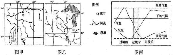 (2)隆冬时节图甲、图乙两区域均可受到图丙所示天气系统影响,简述在该天气系统影响下的天气变化过程。(8分)?