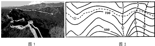 3、单选题 ? “因地形,用险制塞”是修筑长城的一条重要经验,如图1(某段长城的景观照片)。图2为某地区等高线地图。结合相关知识,完成1—2题。