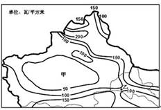小题2:甲处为我国塔里木盆地,中低周高,四周的高山减弱风速,风能资源少于其四周地区。