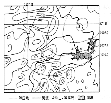 (2)画出A地的风向,并说明A、B两地天气现象的相同点(2分)