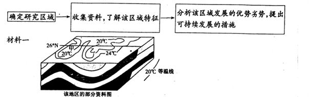 1、综合题  (26分)某学校地理研究学习小组以我国沿海某区域为研究对象,开展研究性学习,其研究思路如下: