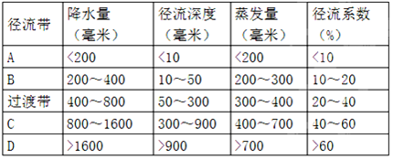 【小题1】由表中资料可知A径流带降水量小于200mm,说明是干旱地区,外力作用应以风力作用为主;D径流带降水量大于1600mm,说明此地气候湿润,降水丰富,外力作用应以流水作用为主。