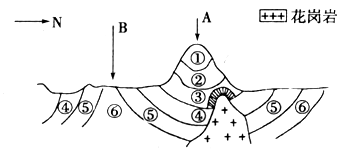 (6)B处为背斜,岩层中间老,两翼新,故图中②④⑥岩层由新到老的关系是②④⑥ 。
