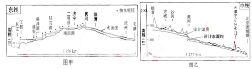 材料二?南水北调东线、中线工程输水干线纵断面示意图(图甲、图乙)。