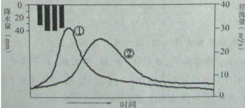 (2)本题考查人类活动对地表径流的影响。城市建设导致水泥路面增多,影响地表水的下渗,地面径流增多,水位变高。所以最能反映该地2007年的河流洪水流量过程线是①。该流量过程线的观测点应位于城区河流的下游,所以是材料一图中的乙 。