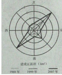 (1)据材料一、二分析,1988年以来,该城市主要向________和________扩展,影响其扩展的主导因素是________ 。(3分)