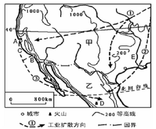 (4)①箭头是指美国工业由东北向西部和南部扩散。②③箭头指美国将工业转移到发展中国家墨西哥。