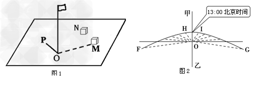 1、综合题 如图1,北回归线以北某学校研究性学习小组在学校的操场O处立一垂直于地面、高为3米的旗杆,OP表示正午时旗杆在地面上的影子,其长度随时间发生变化,当北京时间为某日13时,测得该旗杆的影子达一年中最短,此时OP=3cot83o56’米;M处有一楼房,高度为60米,且OM垂直于OP。图2为该校研究性学习小组绘制的当日内旗杆杆影轨迹示意图(O为立杆处,虚线为杆影,曲线为杆影端点轨迹)。读图1、2,完成下列各题。